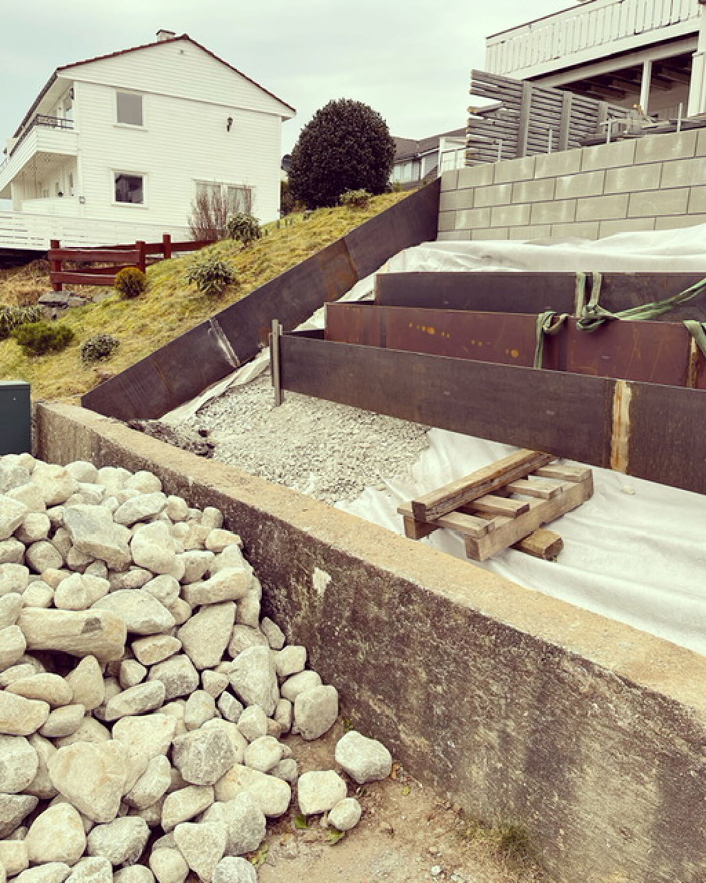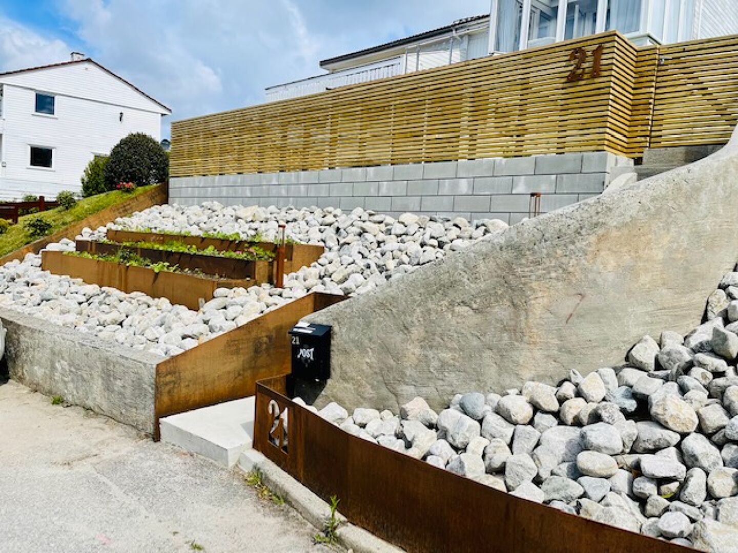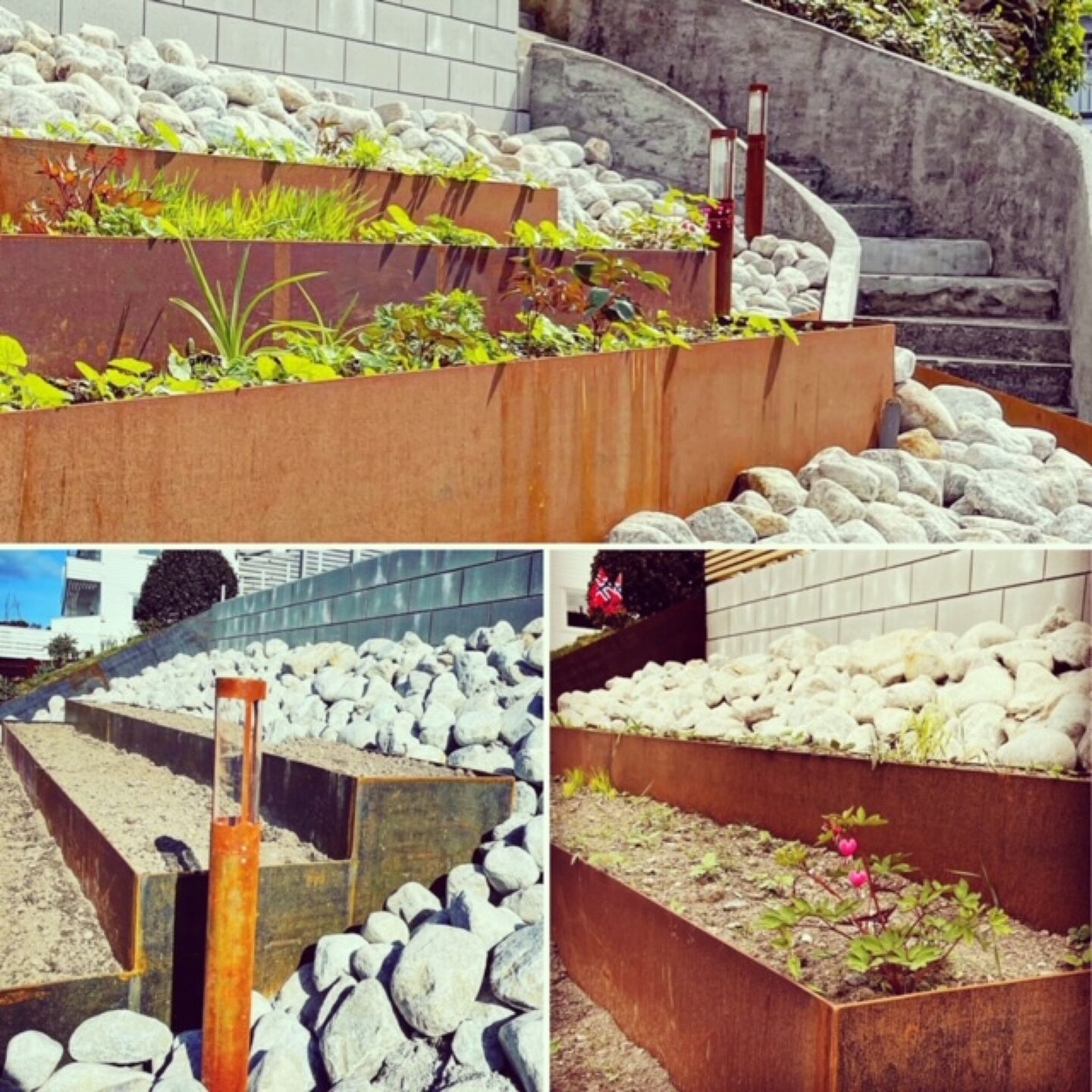 Vi ønsket å gjenbruke/reparere så mye som mulig av eksisterende betong m.m og legge til en fargerik hage del ved hjelp av corten stål.